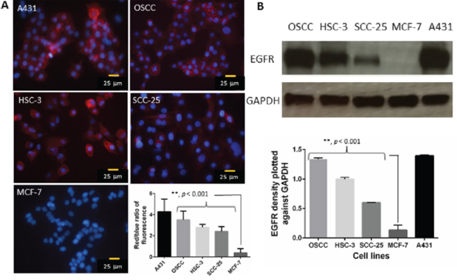 Figure 1: A. Representative immunofluorescence images show the expression of EGFR in A431 (positive control), OSCC, HSC-3, SCC-25 and MCF-7 cells (negative control). Red fluorescence represents EGFR and the blue fluorescence depicts nuclei, stained by Hoechst 33342. B. Western blotting analysis was performed to confirm the above results. The ratio of EGFR intensity was plotted against GAPDH. Error bars represents standard error of the mean.