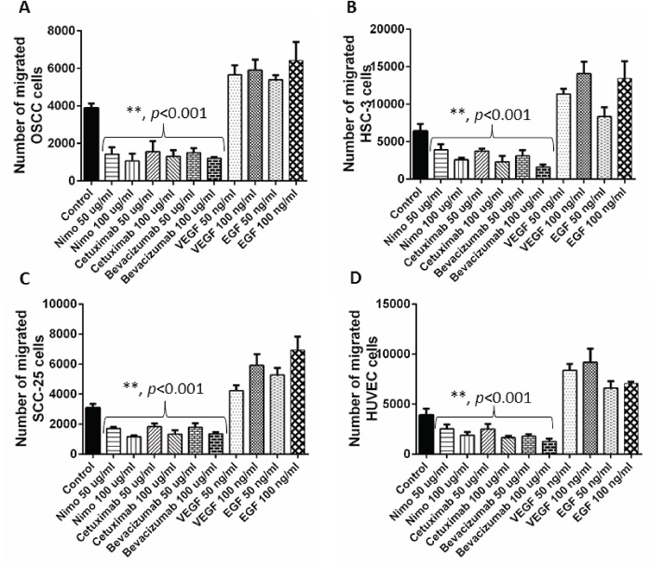 Figure 2: Cell migration assay was performed to understand the anti-angiogenic effects of EGFR inhibitors, nimotuzumab and cetuximab in OSCC A. HSC-3 B., SCC-25 C. and HUVEC D. cells. Migrated cell number was determined by performing a fluorescent cell dose curve. Bevacizumab was used as the positive control and VEGF and EGF were used as negative controls. Error bars represent the standard error of the mean, n = 6 wells.