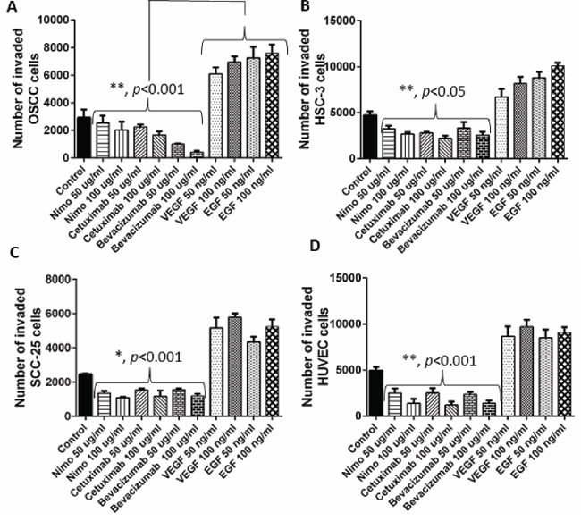 Figure 3: Invasion of OSCC. A. HSC-3 B. SCC-25 C. and HUVEC D. cells through the extracellular matrix (ECM) was assessed understand the anti-angiogenic effects of EGFR inhibitors, nimotuzumab and cetuximab. Number of invaded cells was determined by performing a fluorescent cell dose curve. Bevacizumab acted as the positive control and VEGF and EGF were used as negative controls. Error bars represent the standard error of the mean, n = 6 wells.