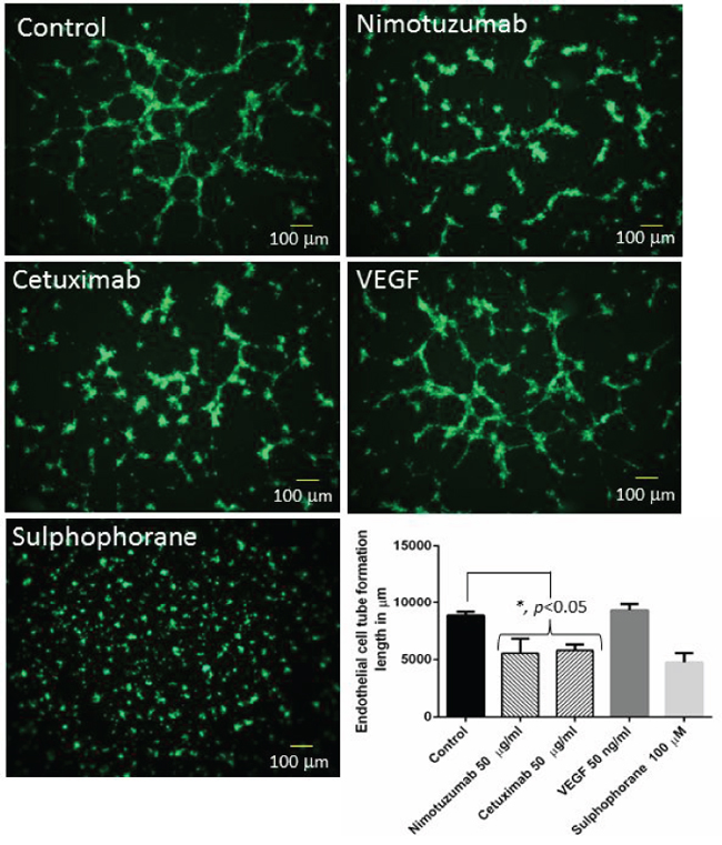 Figure 4: Representative images of tube formation using HUVEC cells. Nimotuzumab and cetuximab disrupted tube formation compared to control. VEGF was used as the positive control and sulphophorane was used as the negative control. The length of endothelial tube formation was measured in μm using Image Pro Plus 6.0 software.