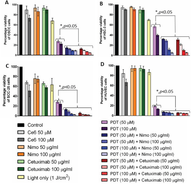 Figure 5: Cell viability was measured quantitatively using a colorimetric detection kit in OSCC. A. HSC-3 B. SCC-25 C. and HUVEC D. for different treatment groups. Percentage cell viability was calculated against control. Combination of PDT and EGFR inhibitors, nimotuzumab and cetuximab significantly (p < 0.05) increased tumor cell death in all the cell lines compared to the PDT treatment alone. Error bars represent the standard error of the mean of triplicate experiments.
