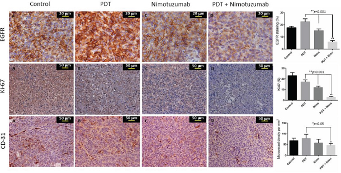 Immunohistochemistry was performed on paraffin embedded tumor tissue for all the 4 treatment groups (Figure 7). EGFR expression was evaluated in the various treatment groups. As EGFR is a membrane protein, staining of the cell membrane was observed. Increased EGFR expression was observed in the tumors treated with PDT (22.6%) when compared to control (17.8%) and nimotuzumab treated tumors (15.3%). Mild EGFR staining (6%) was observed in the combination therapy group of PDT + nimotuzumab. The nuclear antigen Ki-67 is a proliferation marker expressed only in cycling cells. Ki-67 staining was significantly lower (p < 0.001) in the PDT + nimotuzumab treated tumors (3%) compared to control (23%) and tumors treated with PDT only (17.2) and nimotuzumab only (12). Cluster of differentiation (CD31) staining was performed to assess angiogenesis, which also predicts tumor recurrence. The endothelial cells stained by CD31 in the tumor tissue were not well organized and the vessels were fragmented compared to normal blood vessels. Significantly lower (p < 0.001) and more scattered microvessel staining (CD31) was observed in the PDT + nimotuzumab (Microvessel density (MVD) 45.4/mm2) tumors compared to control (MVD 67.4/mm2), PDT (MVD 77.8/mm2) and nimotuzumab treated tumors (MVD 57/mm2). However, open lumen vasculature were observed in the combination therapy treated tumors which may suggest vessel maturation and increased functionality of vessels.