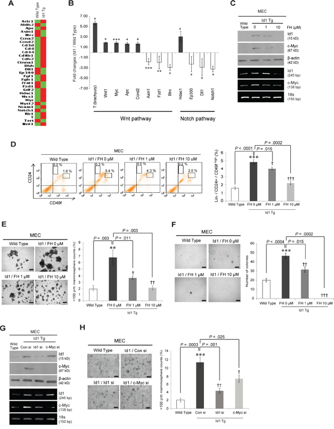 Figure 5: Id1 promotes mammary stem cell activities through the Wnt-mediated c-Myc upregulation. A. Heat map of the gene expression profiles. A statistically significant > 1.5-fold change in MaSCs from MMTV-Id1 mice compared with those from wild-type mice was detected using Mouse Stem Cell RT2 Profiler PCR Arrays. The result is the average value of three independent MaSC samples. B. Pathway analysis of Id1 target gene lists from the arrays. Data represent the means ± SD (n = 3 independent samples; *P < .05, **P < .01, ***P < .001 vs. control, Student t test). C. MECs from MMTV-Id1 mice were treated with the indicated dose of the β-catenin/TCF inhibitor FH535 (FH) for 48 h, and the expression levels of Id1 and c-Myc were detected by reverse transcription (RT)-PCR and Western blot analysis. 18s rRNA was used as an internal loading control. D. FACS analysis of CD24 and CD49f expression in Lineage (Lin)-negative MECs from MMTV-Id1 mice after treatment of the MECs with FH535. The histogram shows Lin−/CD24med/CD49fhigh MaSC percentages (left panel). The bar graph shows the quantification of the result (right panel). E and F. Mammosphere-forming E. and soft agar colony-forming F. abilities of MECs from MMTV-Id1 mice after inhibition of Wnt/c-Myc signaling by FH535. G. MECs from MMTV-Id1 mice were treated with the indicated siRNAs for 48 h, and the expression levels of Id1 and c-Myc were detected by RT-PCR and Western blot analysis. H. Mammosphere-forming ability of MECs from MMTV-Id1 mice treated with Id1 or c-Myc siRNA. All experiments were performed in triplicate. Results in D–F. and H. are shown as the means ± SD (n = 3 independent experiments; */†P < .05; **/††P < .01; ***/†††P < .001 vs. the wild type and Id1 controls, respectively, Student t test).
