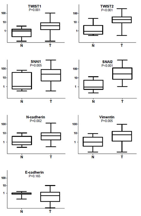 Figure 1: Box-and-whiskers plot representing relative expression levels of EMT-related genes in HNSCC (T) and normal mucosae (N). Gene expression levels are shown on the ordinate (log scale). The upper and lower horizontal lines of the box correspond to the first and third quartiles, the middle horizontal line the median, the whiskers maximum and minimum values. Wilcoxon-Mann-Whitney test was used to compare median values in normal and tumor samples.