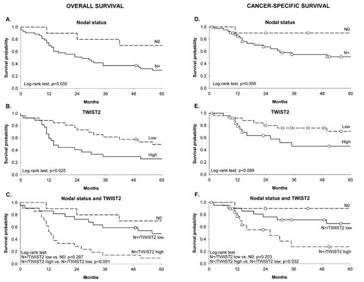 Figure 3: Kaplan-Meier estimates of overall survival (left panel) and cancer-specific survival (right panel) in oral cavity/pharynx cancer patients according to nodal status (A, D), TWIST2 expression (B, E) and combined nodal status and TWIST2 expression (C, F). White dots represent censored subjects.