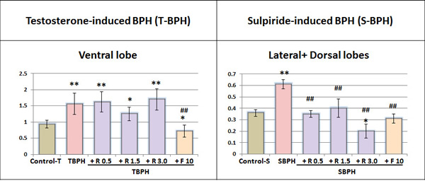 Figure 1: Relative weight of the ventral lobe and or lateral+dorsal lobes of the prostate. Lobes weight (mg) divided by total body weight (g). Values are means ± SE; Control +T and TBPH groups n = 9, other groups n = 10. Animals were treated as described in Table 1. Superscript signs show significant difference: * – from Control-T or Control-S, ** - p < 0.01, *p < 0.05, # – from TBPH or SBPH, ## - p < 0.01, # - p < 0.05. R – Rapatar; F- Finasteride.