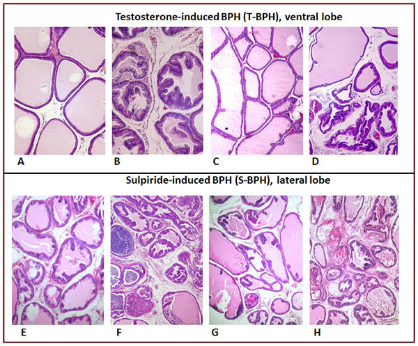 In men, BPH is accompanied by inflammation in the stroma and by advances to suppurative exudate in the acinar lumen. Similar alterations were observed in rats treated with testosterone and sulpiride, in agreement with previous reports [12, 14].