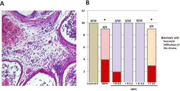 Figure 5: Sulpiride-induced inflammation in PG lateral lobes. A. Stromal and periglandular inflammation induced by Sulpiride (S-BPH): lymphocytes in the stroma and in the intraepithelial space. B. Effect of Rapatar or Finasteride on prostate inflammation induced by Sulpiride (* – statistical difference from Control-S, p < 0,05)