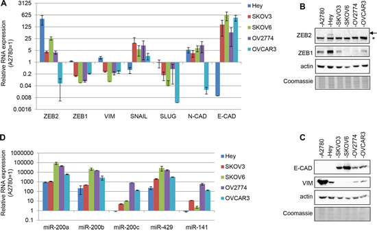 Figure 1: Expression of EMT markers in ovarian adenocarcinoma cell lines. A. Q-PCR analysis of ZEB2, ZEB1, vimentin, SNAIL, SLUG, N-cadherin and E-cadherin mRNAs expression in A2780, SKOV3, SKOV6, OV2774 and OVCAR3 cell lines. B. and C. Representative Western Blots for EMT markers, respectively on nuclear lysates (B) and total lysates (C) in the cell lines indicated. The arrow indicated ZEB2 protein band and the asterisk indicated an unspecific band. Actin probing served as loading control. The Coomassie staining was used as additional loading control. D. Q-PCR analysis of miR-200a, miR-200b, miR-200c, miR-429 and miR-141 expression in cell lines as in (A) In bar charts (A) and (B) expression was normalized on the levels measured in A2780 cells (=1); bars and error bars refer to mean and SD of two experiments performed in triplicate.