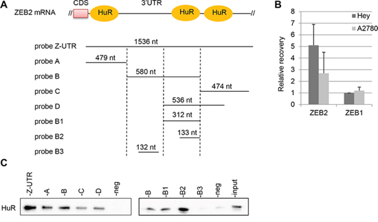 Figure 3: HuR associates with ZEB2 mRNA. A. Schematic representation of the beginning sequence of ZEB2 3′UTR and of the RNA probes utilized for the pull-down experiments. The predicted sites of HuR binding were shown and the length of the the probes were indicated. B. RIP assay performed on Hey and A2780 cell lines with anti-HuR antibody. The recovery of ZEB2 and ZEB1 mRNAs from the input RNAs were quantified, normalizing the values for the unspecific IgG RIP and for the control HPRT mRNA. Bars and error bars refer to mean and SD of two experiments performed in triplicate. C. Pulldown assays, with biotinylated RNAs spanning different segments of the 3′UTR, as depicted in (A). The association of HuR with these probes was detected by Western Blot analysis. The negative control and the input extract were indicated.