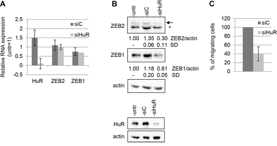 Figure 4: HuR modulates ZEB2 expression and affects cellular migration. The experiments were performed on Hey cells untrasfected, trasfected with siHuR oligos or with siC oligos and incubated for 48 hours. A. Q-PCR analysis of HuR, ZEB2 and ZEB1 mRNAs expression, values are expressed relative to the levels measured in untrasfected cells (=1). Bars and error bars refer to mean and SD of three experiments performed in triplicate. B. Representative Western Blots analysis of ZEB2 and ZEB1 protein expression on nuclear extracts and of HuR protein expression on total extracts. The arrow indicated ZEB2 protein band and the asterisk indicated an unspecific band. Actin probing served as loading control. The values from densitometric analysis of the bands were normalized for actin and expressed relative to untrasfected cells. Standard deviations (SD) are also indicated. C. Transwell migration assays. The values are expressed as percentage of migrating cells relative to siC-transfected cells. Bars and error bars refer to mean and SD of two experiments performed in duplicate.