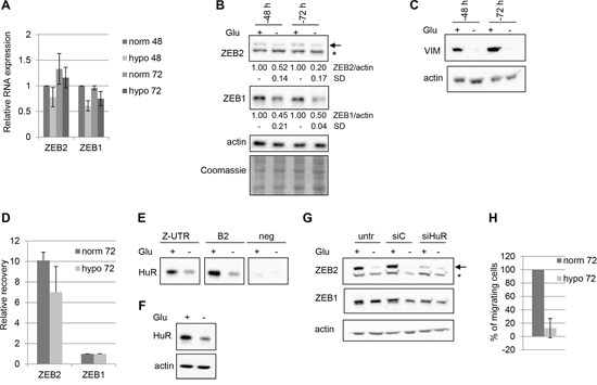 Overall, the positive role of HuR in modulating ZEB2 expression was confirmed, as the decrease of HuR binding in hypoglycemic conditions correlated with reduced ZEB2 expression, with associated reduced migration ability.