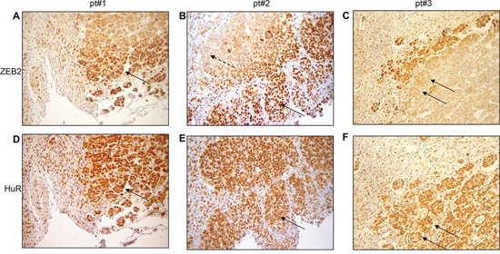Figure 6: In tumor edge nuclear ZEB2 co-localizes with cytoplasmic HuR. Representative immunohistochemical analysis in ovarian cancers for three patients (pt#1, pt#2, pt#3) showing nuclear ZEB2 staining in the edge (A. and B. continuous arrows), cytoplasmic ZEB2 staining in the inner core (B, dashed arrow) and nuclear and cytoplasmic HuR staining D. and E. in sequential slides from A and B. The weak ZEB2 staining in pt#3 C. is indicated by arrows, as the corresponding HuR staining F. in sequential slide.