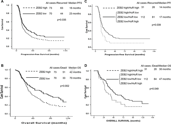 Firstly, analysis of ZEB2 mRNA was performed using the nanofluidic technology. As previously reported [23–24], the median served as the cut-off value to identify group of patients with high or low levels of ZEB2 mRNA. We observed a statistically significant decreased PFS (p-value = 0.035), and OS (p-value = 0.002) in patients with high expression levels of ZEB2 mRNA, compared with patients with low expression levels (Figure 7A, 7B).