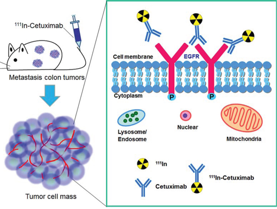 In this study, initial we used 111In labeled cetuximab to target EGF receptors in subcutaneously induced human colon tumor, and then further applied it for the diagnosis of human metastatic colorectal adenocarcinoma (Figure 1). We considered that 111In-cetuximab can be used for the diagnosis of human metastatic colon cancer, and then providing enhanced therapeutic effect.