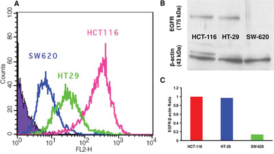 Figure 2: Flow cytometry analysis and western blot of EGF receptor expression in HCT-116, HT-29 and SW-620 colon cancer cell lines.