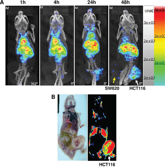 Figure 4: Nano-SPECT/CT. A. images in HCT-116 and SW-620 subcutaneously tumors images obtained after 1, 4, 24, 48 hours intravenous injection of 111In-Cetuximab. HCT-116 bearing in right leg, SW-620 bearing in left leg. Autoradiography B. images obtained at 48 hours after intravenous injection of 111In-Cetuximab.