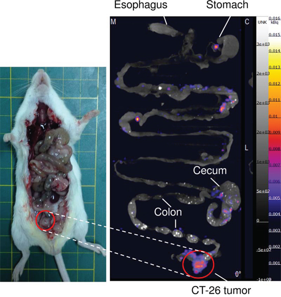 In vivo CT-26 cell bearing orthotropic tumor image and ex vivo nano-SPECT/CT image of 111In-cetuximab were obtained at 72 h intravenous on days 9 in situ colorectal tumor.