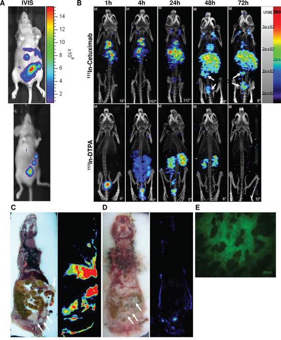 HCT-116/Luc bearing metastatic colorectal tumors mice received an intravenous injection of 111In-cetuximab and 111In-DTPA, equivalent to 22.2 MBq of 111In, when tumors reached a volume of 5 to 60 mm3. The distribution of 111In-cetuximab in the mice bearing HCT-116/Luc adenocarcinoma tumors was evaluated by nano-SPECT/CT images at 1, 4, 24, 48 and 72 hours after the 111In-cetuximab and 111In-DTPA were intravenously injected.