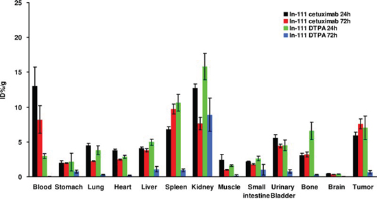 Figure 7: Biodistribution of 111In-cetuximab and 111In-DTPA in metastatic colorectal tumors and normal organs at 24 and 72 hours after intravenous injection. There is a statistically significant difference (P < 0.01) between 111In-cetuximab and 111In-DTPA at 72 hours after injection.