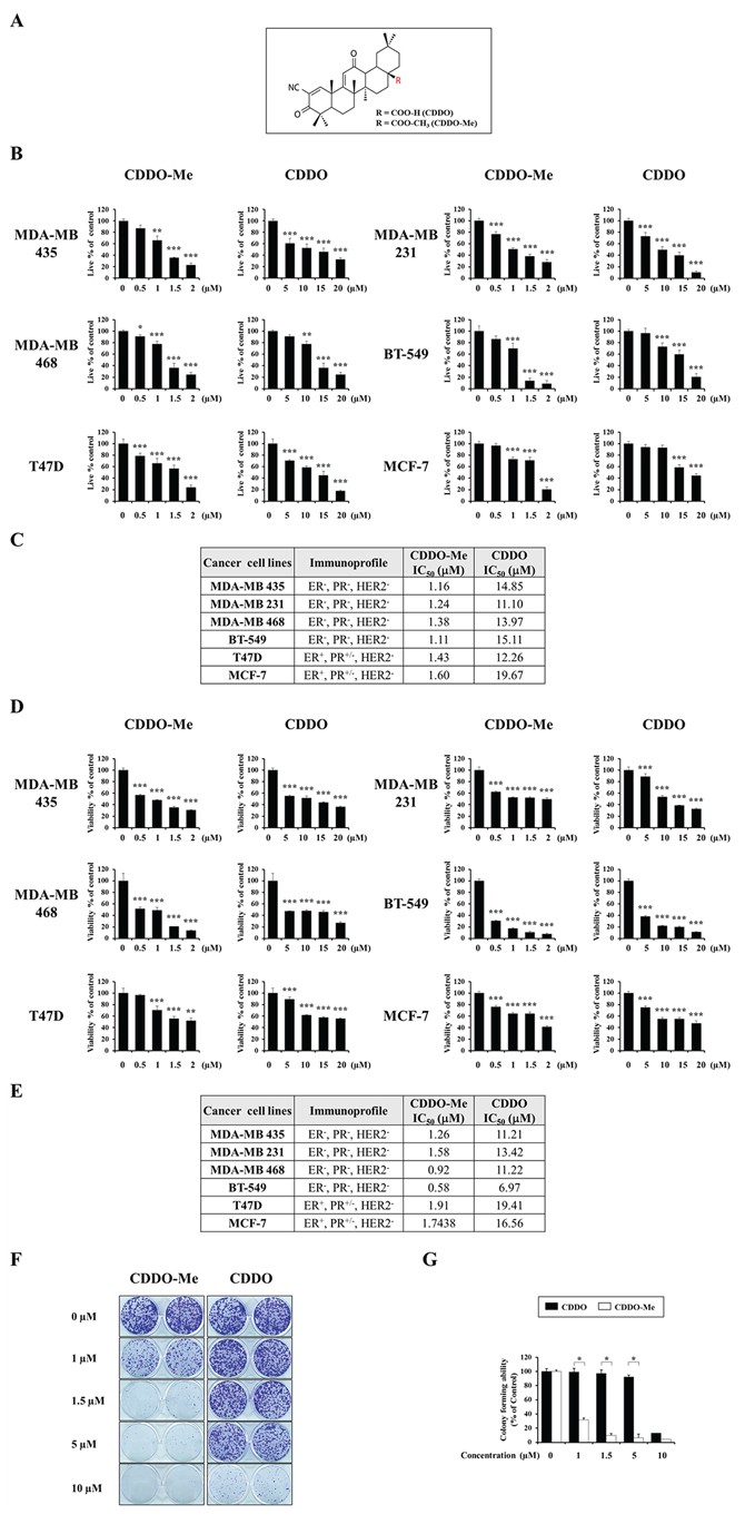 Figure 1: CDDO-Me demonstrates a much stronger anti-cancer effect than CDDO on breast cancer cells. A. Chemical structures of CDDO and CDDO-Me. B. Cells were treated with CDDO or CDDO-Me at the indicated concentrations for 24 h and Live/Dead assay was performed as described in Materials and Methods. Results shown data are mean ± SD of triplicate experiments. C. The values of IC50 (the concentration of each drug that is required to reduce the viability of treated cells for 24 h to 50%) after the viability assay using calcein-AM and EthD-1 were assessed. D. Cells were treated with CDDO or CDDO-Me at the indicated concentrations for 48 h and vability was measured by MTT assay. Results shown data are mean ± SD of triplicate experiments. E. The values of IC50 (the concentration of each drug that is required to reduce the viability of treated cells for 48 h to 50%) after MTT assay were assessed. F. Effects of CDDO-Me and CDDO on the long-term survival of MDA-MB 435 cells. MDA-MB 435 cells seeded on 12 well-plates were treated with CDDO-Me or CDDO at the indicated concentrations for 12 h and then media were replaced with drug-free media. Following the subsequent incubation for 9 days, cells were stained with 0.5% crystal violet. Representative dishes after clonogenic assay are shown. G. Colony-forming units were enumerated and expressed as the percentages of control cells. For B and D, statistical significance was determined by one-way ANOVA followed by Bonferroni post hoc tests. *P < 0.05, **P < 0.01, ***P < 0.001 vs. untreated control. For G, statistical significance was determined by unpaired t-test. *P < 0.001 between the indicated groups.