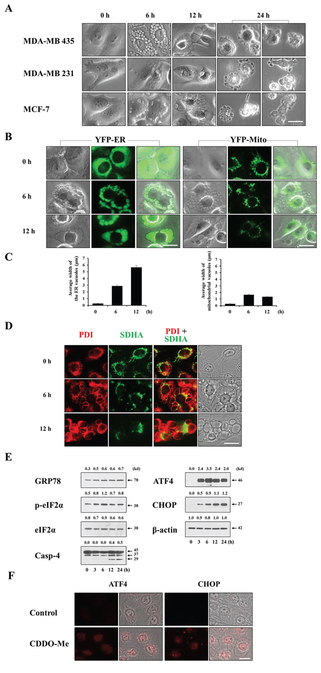 Figure 2: CDDO-Me induces extensive dilation prior to cell death in breast cancer cells. A. Cells were treated with 1.5 μM CDDO-Me for the indicated time points and observed under the phase contrast microscope. Scale bar: 20 μm. B. YFP-ER and YFP-Mito cells were treated with 1.5 μM CDDO-Me for indicated time points and fluorescent microscopy was performed. Scale bar: 20 μm. C. The average widths of the vacuoles originated from the ER or mitochondria were measured in YFP-ER or YFP-Mito cells treated with 1.5 μM CDDO-Me for the indicated time points using AxioVision Rel. 4.8 software (Zeiss) as described in Materials and Methods. Marked increase in the width of the ER-derived vacuoles was observed following treatment with 1.5 μM CDDO-Me. D. MDA-MB 435 cells were treated with or without 1.5 μM CDDO-Me for indicated time points. Immunocytochemistry using anti-PDI (red) and anti-SDHA (green) antibodies was performed and the representative fluorescence and phase contrast microscopic images of cells are shown. Scale bar: 20 μm E. MDA-MB 435 cells were treated with 1.5 μM CDDO-Me for the indicated time points and then Western blotting the proteins associated with ER stress was performed. β-actin was used as a loading control in Western blots. The fold change of protein levels compared to β-actin was determined by a densitometric analysis. F. MDA-MB 435 cells were treated with 1.5 μM CDDO-Me for 24 h and immunocytochemistry of ATF4 and CHOP was performed. Scale bar: 20 μm.