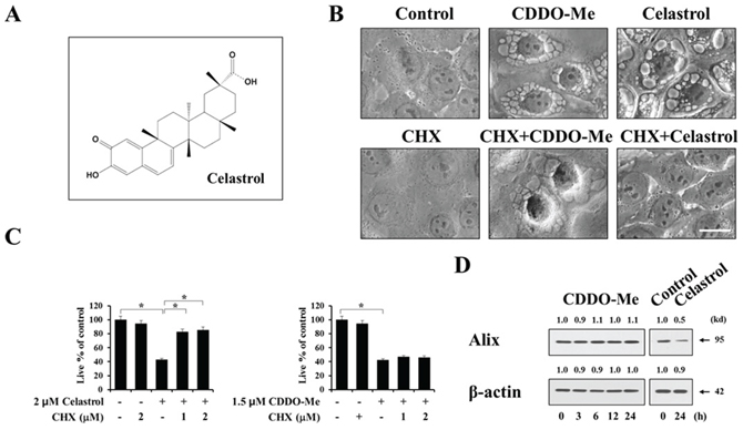 Figure 3: Paraptosis may not be a major cell death mode induced by CDDO-Me in breast cancer cells. A. Chemical structure of celastrol. B. MDA-MB 435 cells were untreated or pretreated with 1 mM cycloheximide and further treated with 1.5 μM CDDO-Me or 2 μM celastrol for 4 h. Cells were observed under the phase contrast microscope. Scale bar: 20 μm. C. MDA-MB 435 cells were pretreated with 1 μM cycloheximide and further treated with 1.5 μM CDDO-Me or 2 μM celastrol for 24 h. Viability was assessed using calcein-AM and EthD-1 as described in Materials and Methods. Results shown are mean ± SD of three independent experiments. Statistical significance was determined using one-way ANOVA followed by Bonferroni post hoc tests. *P < 0.001 between the indicated groups. D. MDA-MB 435 cells were treated with 1.5 μM CDDO-Me for the indicated time points or treated with 2 μM celastrol for 24 h. Western blot1ting of Alix and β-actin was performed. The fold change of protein levels compared to β-actin was determined by a densitometric analysis.