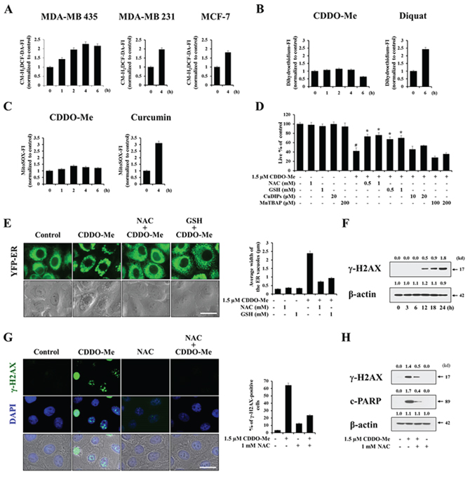 Figure 6: Generation of H2O2 critically contributes to CDDO-Me–induced vacuolation and cell death. A–C. Cells were treated with 1.5 μM CDDO-Me for the indicated time points. Treated cells were exposed to 5 μM CM-H2DCF-DA (A), 20 μM dihydroethidium (B) or 2.5 μM Mito-SOX (C) for 30 min and analyzed by flow cytometry. Fluorescence intensities (FI) of the respective dye were assessed and H2O2, superoxide, mitochondrial superoxide levels were compared between cells treated with and without CDDO-Me for the indicated durations. The fold changes of FI the respective dye are shown in the graph. As the positive inducer of superoxide or mitochondrial superoxide, diquat or curcumin was used. D. MDA-MB 435 cells were pretreated with the indicated concentrations of various antioxidants at the indicated concentrations for 30 min and further treated with 1.5 μM CDDO-Me for 24 h. Cellular viability was assessed using calcein-AM and EthD-1. Results shown are mean ± SD of triplicate experiments. Statistical significance was determined by one-way ANOVA followed by Bonferroni post hoc tests. #P < 0.01 vs. untreated control; *P < 0.01, compared to CDDO-Me treatment. E. YFP-ER cells were pretreated with 1 mM NAC or 1 mM GSH and further treated with 1.5 μM CDDO-Me for 6 h, and then observed under the fluorescence and phase contrast microscope (left). The changes in the widths of the ER-derived vacuoles were quantitatively measured as described in Materials and Methods (right). Scale bar: 30 μm. F. MDA-MB 435 cells were treated with 1.5 μM CDDO-Me for the indicated time points. Western blotting of γ-H2AX and β-actin was performed. G. MDA-MB 435 cells were pretreated with 1 mM NAC and further treated with 1.5 μM CDDO-Me for 24 h. Left: Cells were fixed and immunostained for γ-H2AX; nuclei were counterstained with DAPI. Right: Percentages of cells with more than 30 γ-H2AX foci per cells were assessed and presented graphically. Scale bar: 30 μm. H. MDA-MB 435 cells were pretreated with NAC and further treated with 1.5 μM CDDO-Me for 24 h. Cell extracts were prepared for Western blotting of γ-H2AX, cleaved PARP and β-actin.