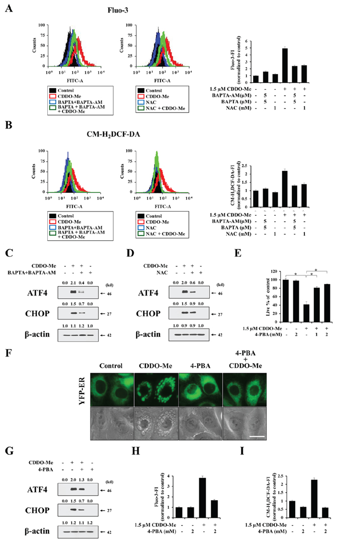 Figure 7: CDDO-Me–induced Ca2+ influx, ROS generation, protein misfolding modulate each other, critically contributing to vacuolation and subsequent apoptosis. A, B. MDA-MB 435 cells were pretreated with 5 μM BAPTA-AM plus 5 μM BAPTA or 1 mM NAC and further treated with or without 1.5 μM CDDO-Me for 4 h. Cells were exposed to 2.5 μM Fluo-3 for 20 min (A) or 5 μM CM-H2DCF-DA and for 30 min (B) and analyzed by flow cytometry. Histograms for the cells treated as indicated are shown (left). X axis, fluorescence intensity, Y axis, relative number of cells. The fold changes of Fluo-3 FI (A) or CM-H2DCF-DA FI (B) compared with that of untreated cells are shown in the graph (right). C, D. MDA-MB 435 cells were pretreated with 5 μM BAPTA plus 5 μM BAPTA-AM (C) or 1 mM NAC (D), and further treated with 1.5 μM CDDO-Me for 6 h. Western blotting of the indicated proteins was performed. E. MDA-MB 435 cells were pretreated with 4-PBA and further treated with 1.5 μM CDDO-Me for 24 h. Cell viability was assessed using calcein-AM and EthD-1. Results shown are mean ± SD (n = 5). Statistical significance was determined by one-way ANOVA followed by Bonferroni post hoc tests. *P < 0.01 between the indicated groups. F. YFP-ER cells were pretreated with 2 mM 4-PBA and further treated with 1.5 μM CDDO-Me for 6 h, and then observed under the fluorescence and phase-contrast microscope. Scale bar: 20 μm. G. MDA-MB 435 cells were pretreated with 4-PBA and further treated with 1.5 μM CDDO-Me for 6 h and Western blotting of ATF4, CHOP and β-actin was performed. H, I. MDA-MB 435 cells were pretreated with 2 mM 4-PBA and further treated with or without 1.5 μM CDDO-Me for 4 h. (H) Cells were exposed to 2.5 μM Fluo-3 for 20 min and analyzed by flow cytometry. The fold changes of Fluo-3 FI compared with that of untreated cells are shown in the graph. (I) Cells were exposed to 5 μM CM-H2DCF-DA and for 30 min and analyzed by flow cytometry. The fold changes of CM-H2DCF-DA FI compared with that of untreated cells are shown in the graph.