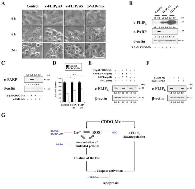 To investigate the functional significance of c-FLIPL downregulation in CDDO-Me–induced cellular responses, we first tested whether exogenously expressed c-FLIPL could block CDDO-Me–induced vacuolation. To this end, we established MDA-MB 435 sublines stably overexpressing c-FLIPL and observed the cellular morphologies following treatment of these cells with CDDO-Me. Interestingly, c-FLIPL overexpression did not block CDDO-Me–induced vacuolation, which was observed beginning 6 h after treating with CDDO-Me (Figure 9A). However, c-FLIPL overexpression did inhibit CDDO-Me–induced cellular shrinkage, blebbing, and formation of apoptotic bodies, morphological changes that were observed in control cells after treatment with CDDO-Me for 24 h. Similarly, z-VAD-fmk pretreatment also failed to block CDDO-Me–induced vacuolation, but did inhibit CDDO-Me–induced apoptotic morphologies. In addition, c-FLIPL overexpression markedly blocked CDDO-Me–induced cleavage of PARP (Figure 9B), effects similar to those of z-VAD-fmk (Figure 9C). When we quantitatively assessed the effect of c-FLIPL overexpression on CDDO-Me–induced cell death, c-FLIPL overexpression partially, but significantly, restored cellular viability in response to CDDO-Me (Figure 9D). These results suggest that c-FLIPL downregulation is critically involved in CDDO-Me–induced caspase-mediated apoptotic cell death. A further examination of the effect of Ca2+ and ROS on c-FLIPL downregulation showed that scavenging Ca2+ with BAPTA plus BAPTA-AM or ROS using NAC failed to block CDDO-Me–induced c-FLIPL downregulation (Figure 9E). 4-PBA pretreatment also did not affect CDDO-Me–induced c-FLIPL downregulation (Figure 9F). These results suggest that CDDO-Me–induced c-FLIPL downregulation is independent of ER-derived vacuolation, which is mainly induced by increases in intracellular Ca2+ and ROS as well as protein misfolding. However, CDDO-Me–induced c-FLIPL downregulation may help tip the balance towards apoptotic cell death in breast cancer cells with structural and functional defects in the ER. Collectively, our results clearly show that ER dilation via Ca2+ influx and ROS generation as well as c–FLIPL downregulation are critically involved in the potent anticancer effects of CDDO-Me on malignant breast cancer cells (Figure 9G).