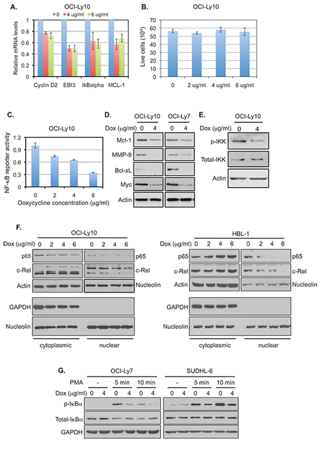 Figure 1: Doxycycline inhibits NF-κB signaling in DLBCL cells. A. The mRNA levels of the indicated NF-κB targets in OCI-Ly10 cells treated with doxycycline for 12 hrs were analyzed by quantitative RT-PCR. The mean and standard deviation (SD) from triplicate samples are depicted. B. The viability of OCI-Ly10 cells, treated as described in (A), was assessed by Trypan blue assay. The assays were carried out in triplicates. C. The OCI-Ly10 cells, which carry a stably integrated NF-κB reporter, were treated with indicated concentrations of doxycycline for 22 hrs. The luciferase activity was measured and normalized to protein concentration. D. DLBCL cells were treated with the indicated concentrations of doxycycline for 24 hrs. The protein levels of the NF-κB-regulated targets were analyzed by western blotting. Analysis of actin was included as a loading control. E. OCI-Ly10 cells were treated with doxycycline for 8 hrs. The levels of the indicated proteins were analyzed by western blotting. F. OCI-Ly10 and HBL-1 cells, both ABC-DLBCL cell lines, were treated with doxycycline for 24 hrs. The levels of indicated NF-κB subunits in cytoplasmic and nuclear fractions, prepared as previously described [86], were analyzed by western blotting (top panels). Lack of GAPDH signal in the nuclear fraction (low panels) indicates the clean preparation of the nuclear fraction. Nucleolin, which is present in both cytosolic and nuclear fractions in cancer cells [87], was used as a loading control. G. Two GCB-DLBCL cell lines, OCI-Ly7 and SUDHL-6, were treated with the indicated concentrations of doxycycline overnight and stimulated with PMA. The levels of the indicated proteins were analyzed by western blotting.