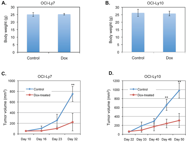 Figure 3: Doxycycline inhibits the growth of DLBCL tumors xenografted in mice. Mice bearing tumors from OCI-Ly7 cells A. or OCI-Ly10 cells B. were injected once daily with either saline (Control) or doxycycline (Dox), starting at day 10 and day 22 after implantation of OCI-Ly7 and OCI-Ly10 cells, respectively. The whole body weight of the mice at completion of the experiments (day 32 and day 50 for OCI-Ly7 and OCI-Ly10, respectively) was measured. The mean and SD are depicted. C. The mean and SD of tumor volume from the mice described in (A) are shown. **indicates significant difference between the control group and doxycycline-treated group (p < 0.01, n = 4 for each group). D. The mean and SD of tumor volume from the mice described in (B) are presented. **p < 0.01 (n = 4 for each group).