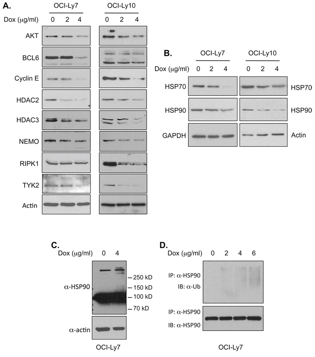 Figure 5: Doxycycline treatment reduces HSP90 activity in DLBCL cells. A. Doxycycline treatment decreases the levels of HSP90 client proteins in DLBCL cells. The DLBCL cells were treated with the indicated concentrations of doxycycline for 24 hrs. The levels of HSP90 client proteins in these cells were analyzed by western blotting. B. Reduced protein levels of HSP70 and HSP90 in DLBCL cells treated with doxycycline. DLBCL cells were treated with doxycycline for 24 hrs, and the levels of HSP70 and HSP90 were analyzed by western blotting. C. Doxycycline treatment leads to HSP90 protein modification. Western blotting analysis of HSP90 protein in OCI-Ly7 cells treated with doxycycline for 2 hrs. D. Doxycycline induces HSP90 ubiquitination. The cell lysates from OCI-Ly7 cells were subjected to immunoprecipitation with an HSP90-specific antibody. The products were then analyzed by western blotting with a ubiquitin antibody (top panel) or an HSP90 antibody (bottom panel).