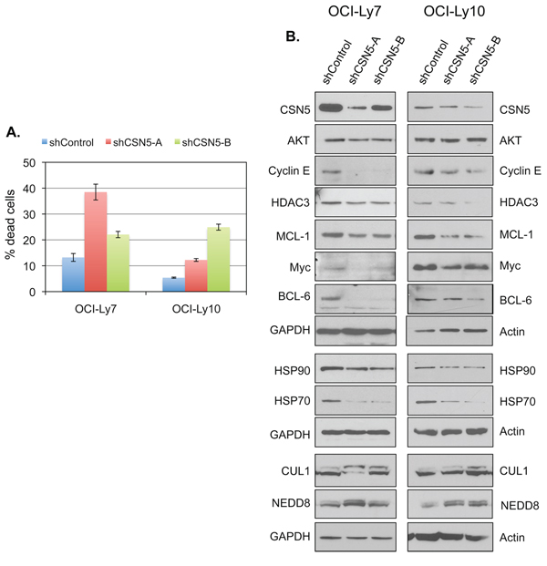 Figure 7: CSN5 is required for the survival in DLBCL cells. A. DLBCL cells were infected with lentiviruses that express shControl, shCSN5-A or shCSN5-B. Seventy-two (for OCI-Ly7) or 96 hours (for OCI-Ly10) after infection, the viability of the infected cells, which express GFP from the viral vector, were analyzed by flow cytometry. Shown are mean and SD from a representative experiment with triplicate samples. B. DLBCL cells were infected with the indicated shRNA-expressing lentiviruses. The levels of the indicated proteins in the infected cells were analyzed by western blotting.