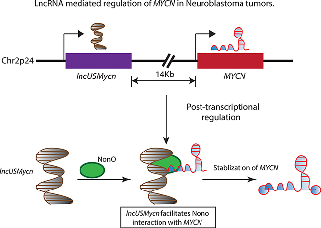 Figure 1: The 2p24 chromosomal region is amplified in several high-risk neuroblastoma patients and is associated with adverse outcomes. The amplified region harbors the MYCN oncogene and a lncRNA lncUSMycn, located 14 kb upstream of the MYCN oncogene. The lncUSMycn noncoding RNA post-transcriptionally regulates the expression of MYCN by acting as a scaffold for the RNA binding protein NonO and facilitating the interaction between NonO and MYCN. This RNA-protein interaction leads to the stabilization of the MYCN transcript and elevating the MYCN-driven transcriptional program in affected individuals.