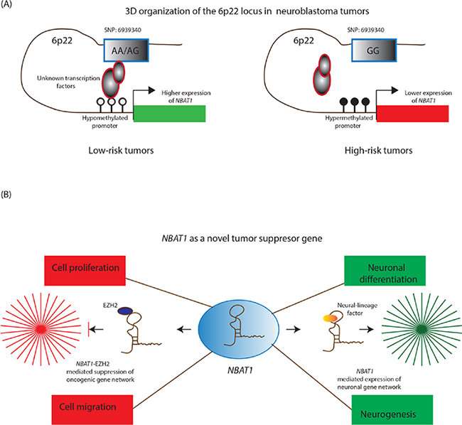 Figure 2: NBAT1 lncRNA controls neuroblastoma progression. A. In low-risk tumors, NBAT1 is expressed at higher levels due to a three dimensional chromosomal interaction between its hypomethylated promoter, the genotype (A/A; A/G) at SNP: 6939340 and unknown transcription factors. On the contrary, this interaction is disturbed in high-risk patients due to hypermethylation of the NBAT1 promoter and the presence of high-risk associated genotype (G/G) at the SNP: 6939340. B. NBAT1 is a tumor suppressor lncRNA and by interacting with chromatin remodeling protein EZH2, it controls tumor progression through suppressing oncogenic networks that drive proliferation and invasion of neuroblastoma cells. In addition, it drives neuroblastoma cells towards neural differentiation by suppressing the expression of NRSF/REST, which represses neural differentiation program in non-neuronal cells.