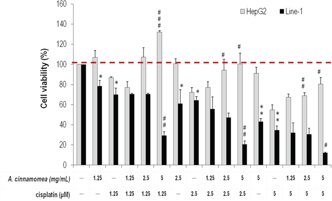 To make sure whether AC differentially protects hepatic cells but inhibits lung carcinoma cells, we examined cell viability and survival rate in the presence of AC by MTS assay. For this experiment, both the mouse line-1 lung carcinoma cell line and the human hepatic HepG2 cell line were used, and results were compared to evaluate the differential cytotoxicity of AC. HepG2 is an immortalized human hepatoma cell line that is frequently used in hepatocyte-function-related studies [32]. Cells were treated with various concentrations of AC (1.25, 2.5 and 5.0 mg/mL) for 48 h, where the number of line-1 lung carcinoma cells declined significantly while that of HepG2 cells had no change (Figure 1). To know if cisplatin synergizes with AC to reduce cell viability, comparison assays were performed. In terms of cell viability and proliferation, HepG2 cells treated with cisplatin or/and AC resulted in quite distinct results as shown in Figure 1: AC does not inhibit the viability of HepG2 cells, while cisplatin has strong cytotoxicity to HepG2 cells in a dose-dependent manner. Surprisingly, AC can reverse the cisplatin-induced cell death also in a dose-dependent manner (p < 0.05). On the other hand, both cisplatin and AC do inhibit line-1 lung carcinoma cells. When both cisplatin and AC were administrated together, a synergistic suppression resulted (p < 0.05, Figure 1). Accordingly, we suggest that cisplatin/AC has an inhibitory effect on tumor growth (line-1 cells); AC has a protective effect on hepatic cells, particularly the cisplatin-induced cytotoxicity.