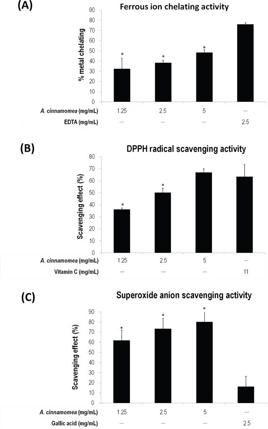 Figure 2: Antioxidation activity of A. cinnamomea. The antioxidation activity for A. cinnamomea was determined by the ferrous ion chelating assay. A. the α,α-diphenil-β-picrylhydrazine (DPPH) radical scavenging assay. B. and the superoxide anion scavenging assay C. Data, which are derived from at least three independent experiments, six tests for each, are presented by mean ± SEM. *P < 0.01 indicates significant difference from the positive control.