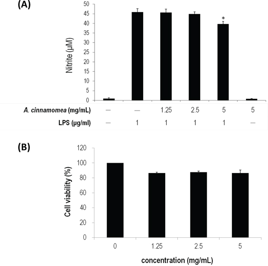 Figure 3: Inhibition of A. cinnamomea on NO production in LPS-stimulated RAW264.7 macrophages. A. Various concentrations (1.25, 2.5 and 5 mg/mL) of A. cinnamomea were evaluated for NO production in LPS-stimulated RAW264.7 macrophages. B. Cytotoxicity of A. cinnamomea was determined by the MTS assay. Values shown are relative to vehicle control, where the value of control cell viability is set to 100%, a representative of three independent experiments. Data, which are derived from at least three independent experiments, six tests for each, are presented by mean ± SEM. 1 μg/mL LPS is a positive control. *P < 0.01 indicates significant difference from the positive control.