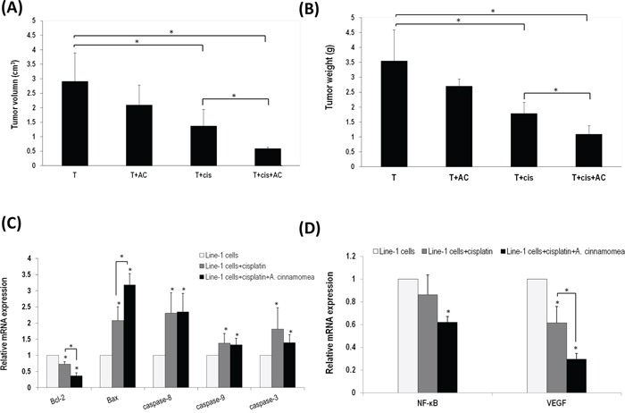 Figure 4: A. cinnamomea and cisplatin synergistically inhibit tumor growth in the line-1 xenografted mouse model. A. Line-1 lung carcinoma cells were established in BALB/cByJ male mice (n = 6) by subcutaneously injecting line-1 cells (3 × 105 cells) into the right thigh. Mice were orally administered with vehicle (T), 300 mg/kg A. cinnamomea (T+AC), 2.5 mg/kg cisplatin (T+cis), or a combination of A. cinnamomea and cisplatin (T+cis+AC) for 18 days. Mice were sacrificed on day 26 and then examined for their tumor volumes. Tumor volumes were calculated using the following formula: (length × width2)/2. B. Examination of tumor weights. C. Estimation of mRNA levels of Bacl-2, Bax, caspases 3, 8 and 9 by quantitative real-time PCR (qRT–PCR) from tumors treated with vehicle control, cisplatin, or the combination of A. cinnamomea and cisplatin. D. Quantification of mRNA levels of VEGF and NF-κB by qRT–PCR in the tumor tissues of all mice treated with vehicle control, cisplatin, or the combination of A. cinnamomea and cisplatin. The value of the vehicle control mRNA is set to 1. Data are expressed as the means ± SD (n = 6 mice per group from two independent experiments). *Significantly different from the compared group (P < 0.05).
