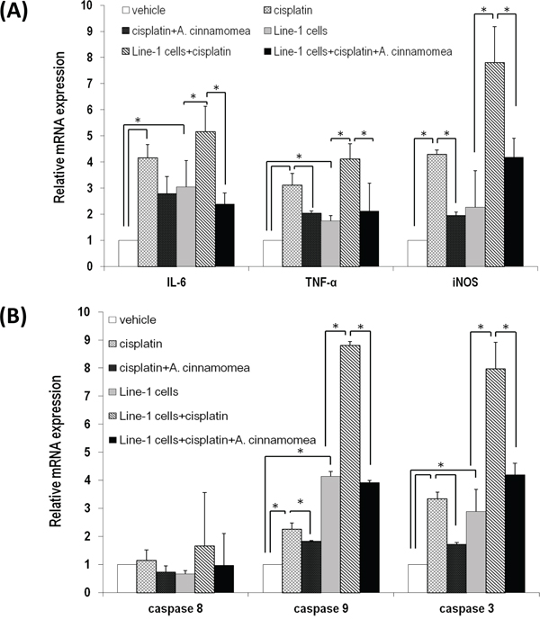 Figure 6: A. cinnamomea decreases cisplatin-induced inflammation and cell apoptosis in liver. A. Quantification of mRNA levels of inflammatory cytokines by qRT–PCR in the liver tissues of all mice treated with vehicle control, cisplatin, or the combination of A. cinnamomea and cisplatin. B. Quantification of mRNA levels of caspases 3, 8 and 9 by qRT–PCR in the liver tissues of all mice treated with vehicle control, cisplatin, or the combination of A. cinnamomea and cisplatin. The value of the vehicle control mRNA is set to 1. Data are expressed as the means ± SD (n = 6 mice per group from two independent experiments). *Significantly different from the compared group (P < 0.05).