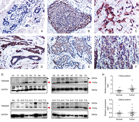 Figure 1: Expression and localization of target protein transmembrane 88(TMEM88) in breast cancer tissues. A. TMEM88 expression was negative or low in normal breast ductal cells(200 ×), B. moderate in carcinoma tissues in situ(200×), C. and high in invasive ductal carcinomas(IDCs; 200×). D. TMEM88 expression was markedly higher in IDCs than in normal breast ductal cells (200×). E. TMEM88 was expressed at extremely high levels in the nuclei of certain samples (200×). F. Few tissue samples exhibited membrane localization of TMEM88 (200×). G. and H. Western blot analysis indicated significantly higher expression levels of the 17-kDa isoform of TMEM88 in the breast cancer tissues than in the paired noncancerous tissues. However, there was no significant difference in the expression levels of the 25-kDa isoform in breast cancer relative to the paired normal tissues.
