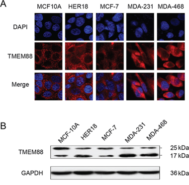 Figure 2: Expression and localization of target protein transmembrane 88 (TMEM88) in breast cancer cell lines. A. Analysis of TMEM88 expression patterns in the MCF-10A, MCF-7, HER18, MDA-MB-231, and MDA-MB-468 cell lines by immunofluorescence microscopy using a TMEM88-specific antibody. Cells primarily exhibited cytoplasmic localization of TMEM88, but not plasma membrane or nuclear localization. B. In the majority of breast cancer cell lines, TMEM88 expression was higher than that in the normal breast cell line MCF-10A, and lower than that in the MCF-7 cell line. The 17-kDa TMEM88 isoform was expressed at significantly higher levels in the triple-negative breast cancer cell lines (MDA-MB-231 and MDA-MB-468) than in MCF-10A cells.