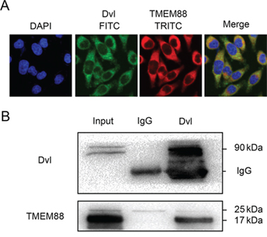 Figure 3: Target protein transmembrane 88(TMEM88) interacts with dishevelled (Dvl). A. Immunofluorescence staining analyses suggest that endogenous TMEM88 co-localized with Dvl in the cytoplasm of MDA-MB-231 cells. B. Co-immunoprecipitation analyses demonstrated that Dvl proteins interacted with TMEM88 in MDA-MB-231 cells, particularly with the 17-kDa isoform.