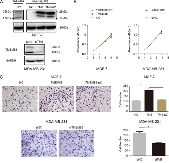 Figure 4: Effect of cytosolic target protein transmembrane 88 (TMEM88) on proliferation and invasion of breast cancer cells. A. Western blot analyses were utilized to assess TMEM88 protein levels after overexpression or silencing of TMEM88 in MCF-7 and MDA-MB-231 cells, respectively. Two isoforms of endogenous TMEM88 (25 kDa and 17 kDa) were detected in MCF-7 cells using an anti-TMEM88 antibody. While a Myc-tag-specific antibody failed to detect the two endogenous isoforms of TMEME88 in cells overexpressing myc-TMEM88 (TMEM88 CRA-a), two exogenous bands that were greater than 17 kDa in size were observed. We propose that the band closest to 25 kDa in size may have resulted from targeting by two tag-specific (Myc and DKK) antibodies, while the other bands may comprise post-translationally modified versions of the protein. In cells expressing the TMEM88-ΔC variant, each of these bands was smaller in size, likely due to sequence truncation. B. MTT assay analyses detected no difference in the proliferation rates of MCF-7 cells overexpressing TMEM88 or TMEM88-ΔC and MDA-MB-231 cells transfected with the TMEM88-specific siRNA. C. Average number of migrating cells that passed through the pores (counted after 16 h). Treatment with the TMEM88 siRNA resulted in a drastic reduction in the invasion rate of MDA-MB-231 cells. Overexpression of TMEM88, but not TMEM88-ΔC, resulted in marked increases in the cell invasion rates of MCF-7 cells. Values represent means ± standard errors (bars) of three independent experiments; *p < 0.05, **p < 0.01 (Student’s t-test); NC, negative control.