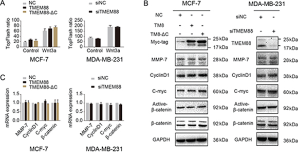 Figure 5: Cytosolic target protein transmembrane 88(TMEM88) did not affect canonical Wnt signaling. A. Overexpression of TMEM88 and TMEM88-ΔC in MCF-7 cells and silencing of TMEM88 in MDA-MB-231 cells using a TMEM88-specific siRNA did not affect the activity of the TOPFlash reporter gene, regardless of treatment with Wnt3a. B. and C. Neither overexpression of TMEM88 and TMEM88-ΔC in MCF-7 cells nor silencing of TMEM88 in MDA-MB-231 cells affected the mRNA and protein expression levels of the target genes of the canonical Wnt signaling pathway (MMP-7, CyclinD1, and C-myc). Values represent means ± standard errors (bars) of three independent experiments; p > 0.05 (Student’s t-test); NC, negative control.