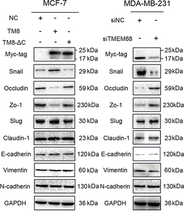 Figure 6: Target protein transmembrane 88(TMEM88) inhibits the expression of Occludin and Zo-1 by promoting Snail expression. Overexpression of TMEM88 resulted in decreased expression of Occludin and Zo-1, and increased expression of Snail in MCF-7 cells; however, there were no significant changes in the expression levels of these proteins in cells overexpressing the TMEM88-ΔC variant. Meanwhile, contrasting results were observed in MDA-MB-231 cells transfected with the TMEM88-specific siRNA. However, modulation of TMEM88 expression had no effect on the expression levels of Claudin-1, E-cadherin, N-cadherin, and Vimentin in either cell line. At least three independent experimental replicates were performed and similar results were obtained for each experiment. Panels contain representative images.