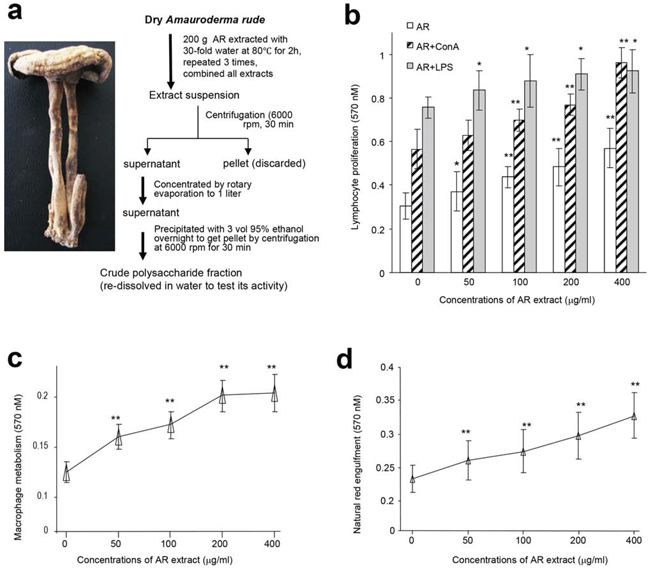 Figure 1: Effects of AR on cellular activities of mouse spleen lymphocytes and macrophages. a. Procedure for preparation of water extract from Amauroderma rude. b. Mouse spleen lymphocytes were incubated with AR extract at 37°C for 44 h, followed by MTT assay. Incubation with AR extract increased lymphocyte proliferation. Inclusion of ConA and LPS displayed additive effect on enhancing lymphocyte proliferation. Asterisks indicate significant differences. *p < 0.05, **p < 0.01. Error bars, SD (n = 5). All experiments were repeated three times. c. In energy metabolism assay, mouse macrophages were incubated at 37°C for 2 h, followed by addition of drugs or AR extract. The cultures were then incubated at 37°C for 20 h followed by MTT assays. Treatment with AR extract improved energy metabolism. Asterisks indicate significant differences. **p < 0.01. Error bars, SD (n = 5). d. In the neutral red engulfment assay, cells in the 96-well plates were incubated at 37°C for 24 h. After centrifugation (1800 rpm, 5 min), 100 μl of neutral red in physiological saline solution (0.1%) were added to each well. The plates were incubated at 37°C for 30 min. After centrifugation (1800 rpm, 5 min), each well was washed with 200 μl PBS twice, followed by addition of 100 μl cytolysate (acetic acid:anhydrous alcohol = 50:50). The cells were incubated at room temperature overnight followed by MTT assay. Incubation with AR extract increased engulfment of neutral red by the cells. Asterisks indicate significant differences. **p < 0.01. Error bars, SD (n = 5).