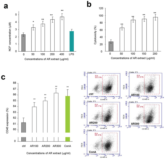 Figure 2: Effects of AR on macrophages and natural killer cells. a. Mouse macrophages were incubated at 37°C for 2 h. Drugs and samples were added to the cultures at the concentrations indicated. The cultures were incubated at 37°C for 48 h followed by Griess assay to measure nitric oxide concentrations. Incubation with AR extract increased the production of nitric oxide by macrophages. Asterisks indicate significant differences. *p < 0.05, **p < 0.01. Error bars, SD (n = 5). All experiments were repeated three times. b. In NK cell assay, the harvested lymphocytes were incubated at 37°C for 2 h followed by treatment with AR extract. The effect of NK cells was assayed as described in the Methods. Incubation with AR extract stimulated and increased the activity of NK cells in killing breast cancer cells. Asterisks indicate significant differences. *p < 0.05, **p < 0.01. Error bars, SD (n = 5). c. Lymphocytes were inoculated and incubated at 37°C for 2 h, followed by addition of drugs and samples. The cultures were then incubated at 37°C for 48 h before flow cytometry analysis for CD45 expression. Incubation with AR extract increased CD45 expression. Asterisks indicate significant differences. *p < 0.05, **p < 0.01. Error bars, SD (n = 5). Right, typical measurements of CD45 levels by flow cytometry.