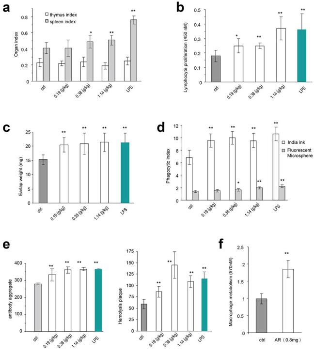 In the humoral immunity assay, we detected a significant increase in the aggregation of antibodies (Figure 3e, left), and the formation of hemolysis plaques (Figure 3e, right), when the mice were treated with AR extract or LPS. In the energy metabolism assay, we detected significant increase in the proliferation of macrophages isolated from mice injected with AR extract (Figure 3f).
